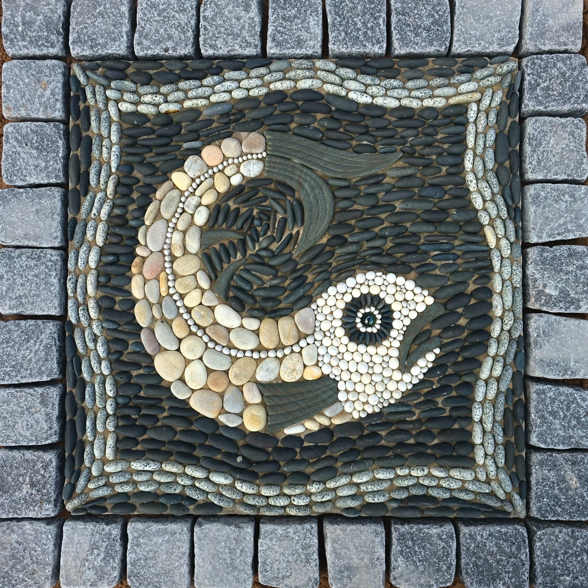 Beautifully illustrative of Maggy’s love of playfulness and exaggeration, the rising fish mosaic is an arresting sight. The fins are created by using diamond disc grinders to cut strong lines into stone, giving a different texture to the round edges of the pebbles. The use of small white limestone provides real contrast against the background blacks. The design is framed by a curved border accentuating the natural arc of the fish.